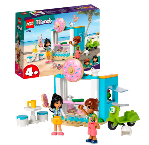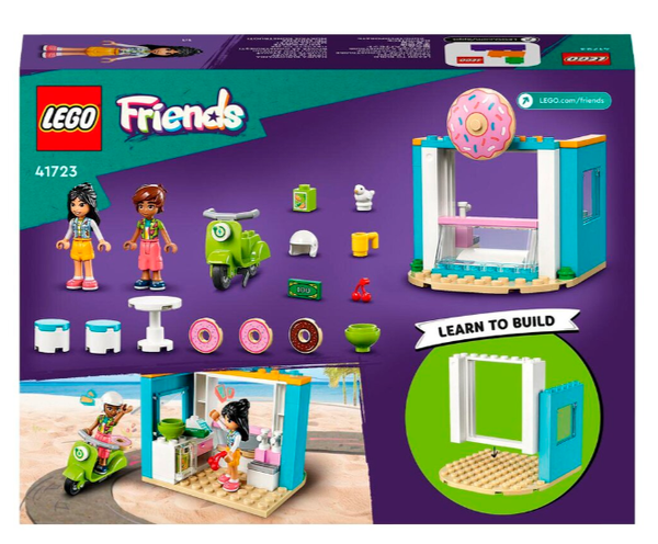 De set wordt geleverd inclusief LEGO Friends personages Liann en Leo, een drive-throughraam en accessoires zoals een scooter, vogel, donuts, sap, geld, tafel en twee stoelen. Deze LEGO Friends Donutwinkelset is circa 8 cm hoog, 8 cm breed en 8 cm diep en bevat een handige startsteen en snelstartelementen waarmee je vol zelfvertrouwen aan de slag kan met bouwen.