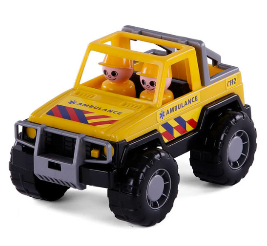 Stoere ambulance auto, gemaakt van stevig kunststof. De auto is voorzien van 4 terreinwielen. Inclusief 2 speelfiguren.