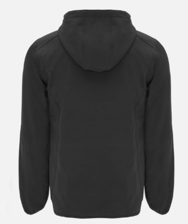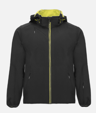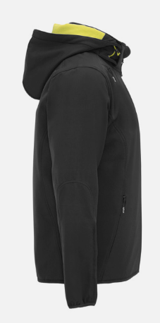 Tweelaags softshell in sportieve snit: Centrale rits in contrastkleur met kinbeschermer en trekker. Binnenvoering in microfleece-stof in contrastkleur. Buitenzak op rechterborst met onzichtbare rits in diagonaal. Twee buitenzijzakken met onzichtbare rits. Zak op linkermouw. Elastische bies in dezelfde kleur op manchetten en onderkant. Uitneembare capuchon met microfleece voering in contrastkleur.