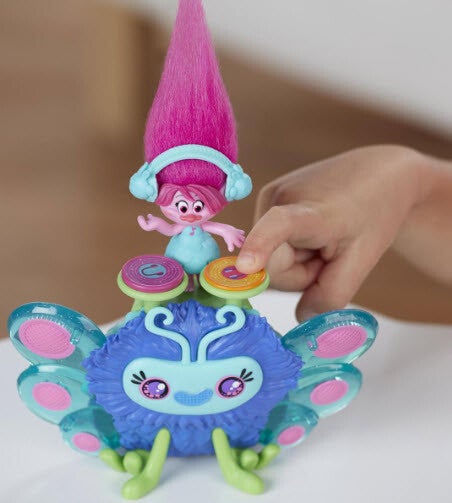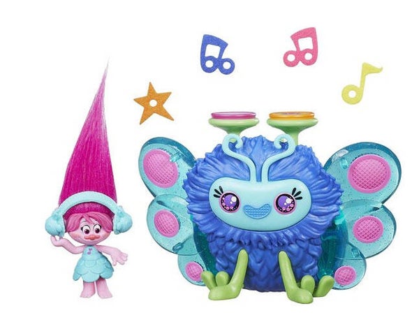Poppy is de heldhaftige leider van het kleurrijke Trolls volkje en draagt een muzikale outfit. Ze maakt iedereen blij en gelooft dat je met een liedje in je hart alles voor elkaar kunt krijgen. Druk op de oranje plaat van het Wooferburg beest en je hoort een nummer uit de film. Terwijl je het nummer hoort kan je nog eens op de knop drukken voor coole DJ-effecten. Met de 4 Fuzzy Flair onderdelen kan je de Wooferbug en Poppy's kapsel versieren.